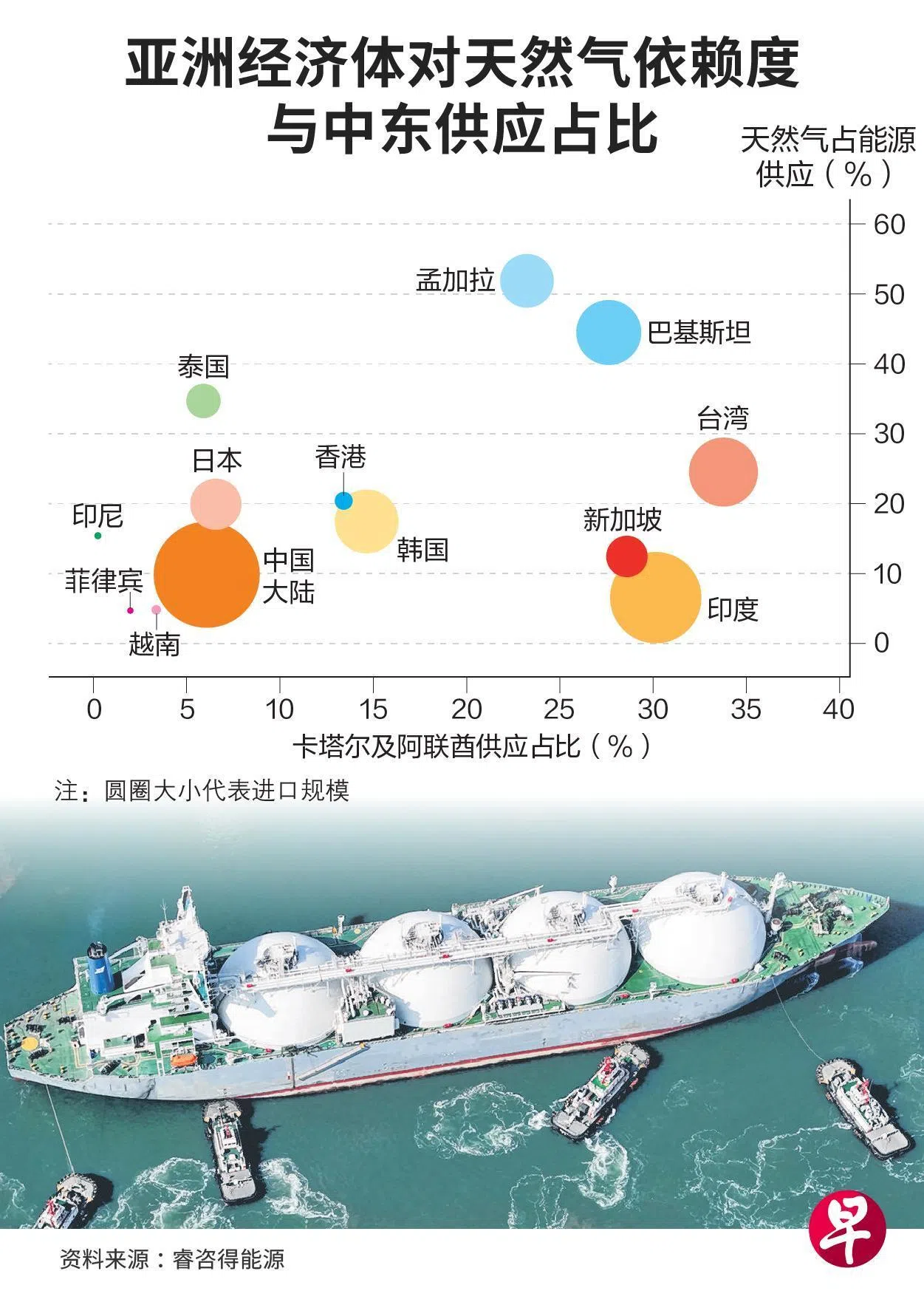 根据睿咨得能源最新发布的报告,新加坡进口的天然气中有近三成来自中东。至于其他亚洲经济体,中国和印度高度依赖中东的能源供应,预计受到的冲击最大。